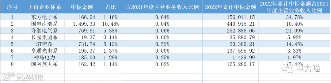 在喵喵观察的上市公司和相关系统内企业中,其中8家上市公司自身有中标或者下属公司(不包含平级公司、母公司)有中标,涵盖的企业数量有11家;另有2个相关系统的企业自身有中标或者下属公司有中标(不含上市公司部分),涵盖的企业数量有4家。