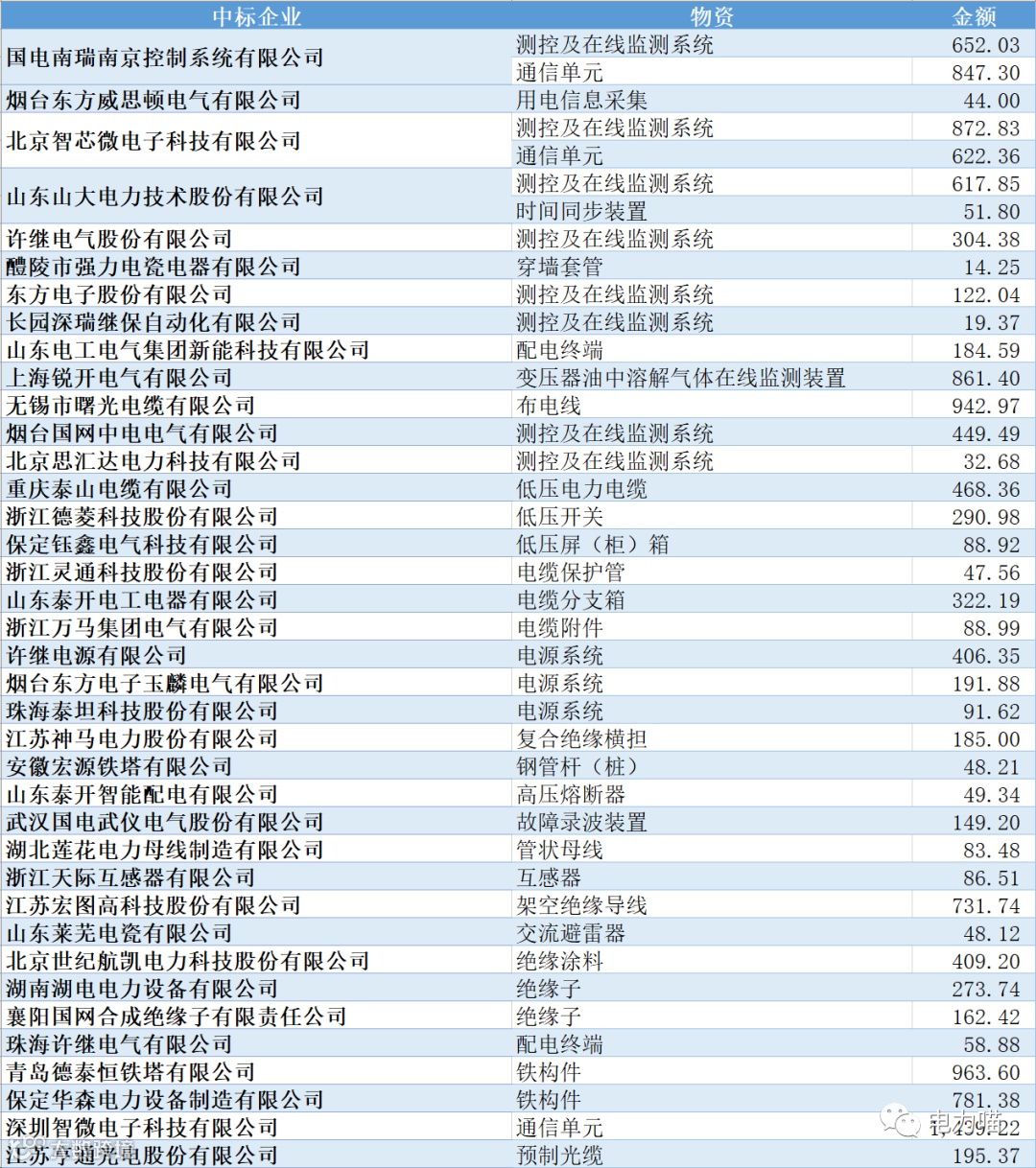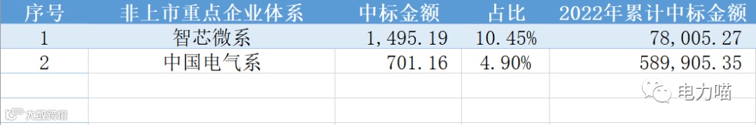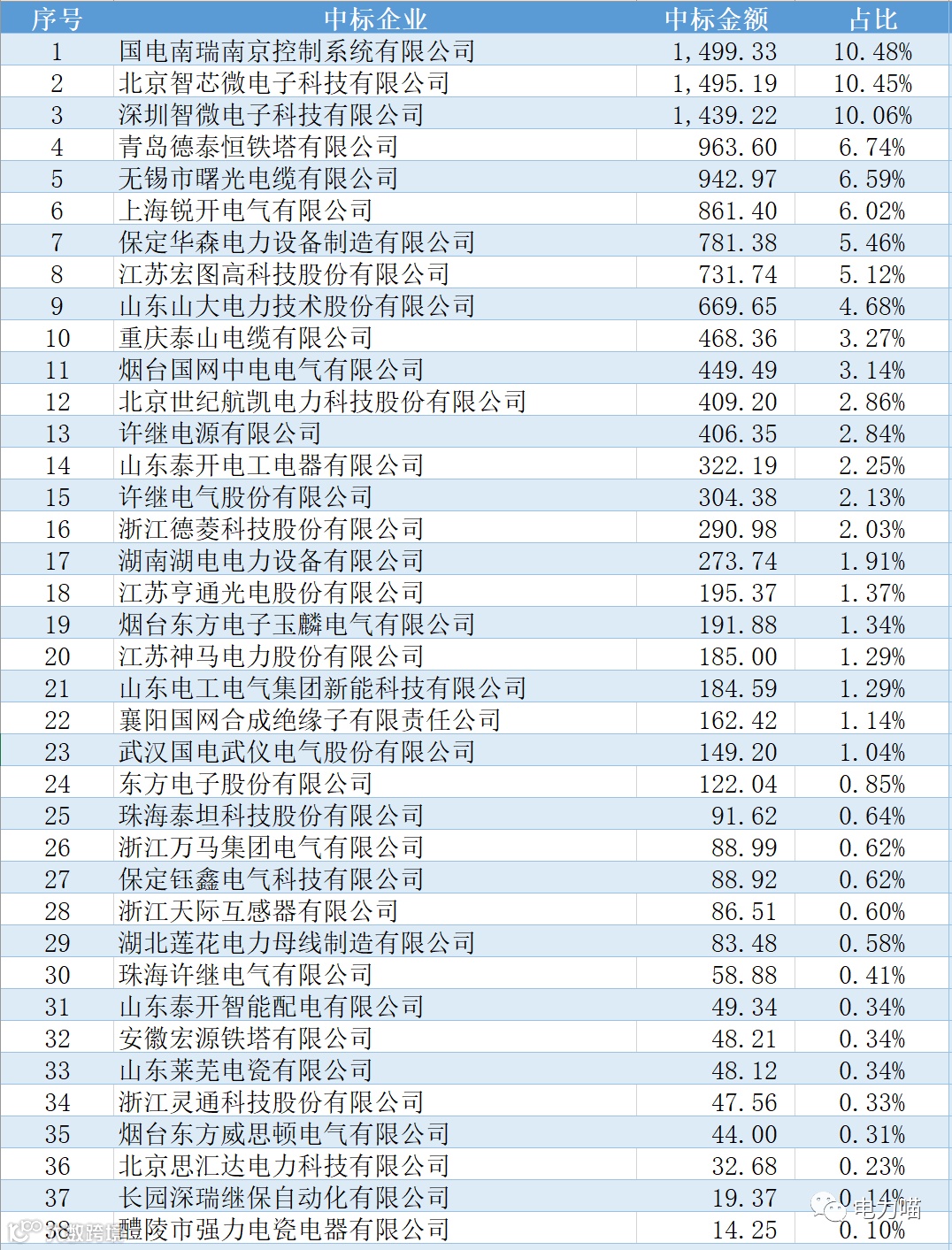 根据最终中标情况,本次两个项目共有38家企业中标,合计中标金额约14,302万元。单一企业中标金额最多的是国电南瑞南京控制系统有限公司,中标金额约为1,499万元,占比约10.5%。中标金额超过1,000万元的企业共有3家。