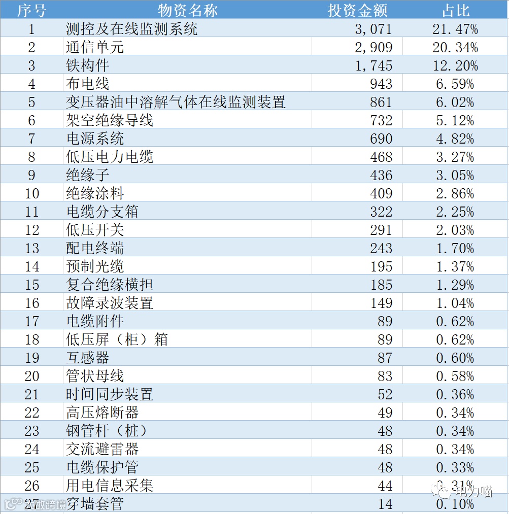 国网宁夏2022年第一次配网物资协议库存招标项目共招标了27种物资,从各物资投资力度角度,结合中标金额,测控及在线监测系统物资投资力度最大,合计3,071万元,占比约21.5%;通信单元物资投资力度其次,共2,909万元,约占本次招标项目的20%。