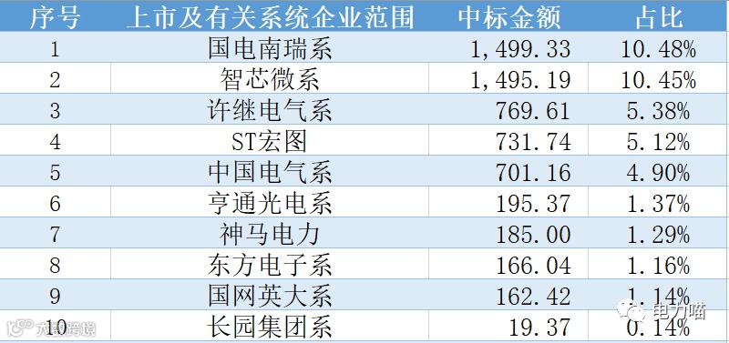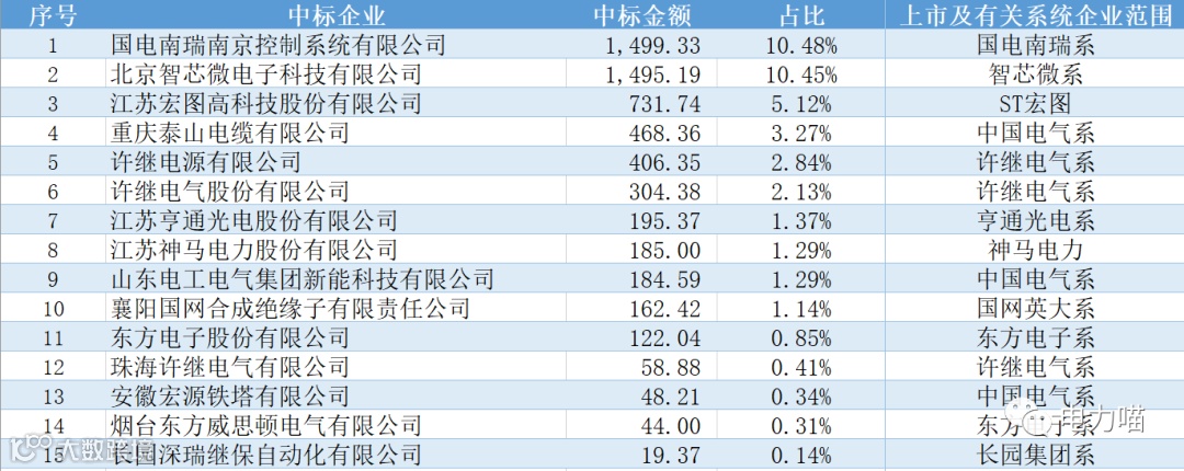 综合来看,国电南瑞系企业合计中标金额最高,约1,499万元,占本次招标总金额的10.5%。许继电气系有3家企业中标,中国电气系有3家企业中标,东方电子系有2家企业中标。