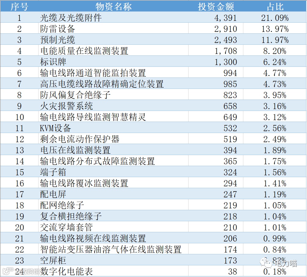 国网浙江2022年第一次物资协议库存招标项目共招标了24种物资,从各物资投资力度角度,结合中标金额,光缆及光缆附件物资投资力度最大,合计44,391万元,占比约21%;防雷设备物资投资力度其次,共2,910万元,约占本次招标项目的14%。