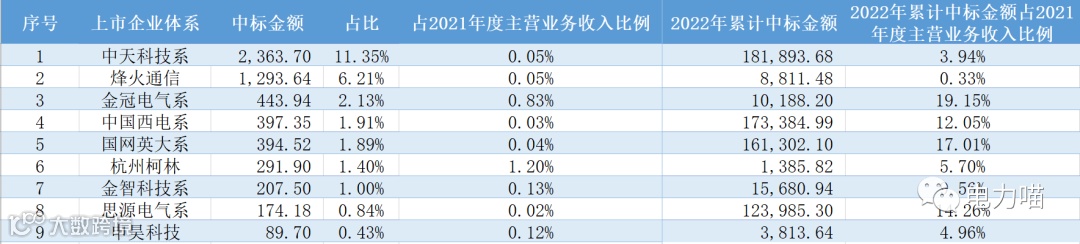 在喵喵观察的上市公司和相关系统内企业中,其中9家上市公司自身有中标或者下属公司(不包含平级公司、母公司)有中标,涵盖的企业数量有9家;另有3个相关系统的企业自身有中标或者下属公司有中标(不含上市公司部分),涵盖的企业数量有3家。