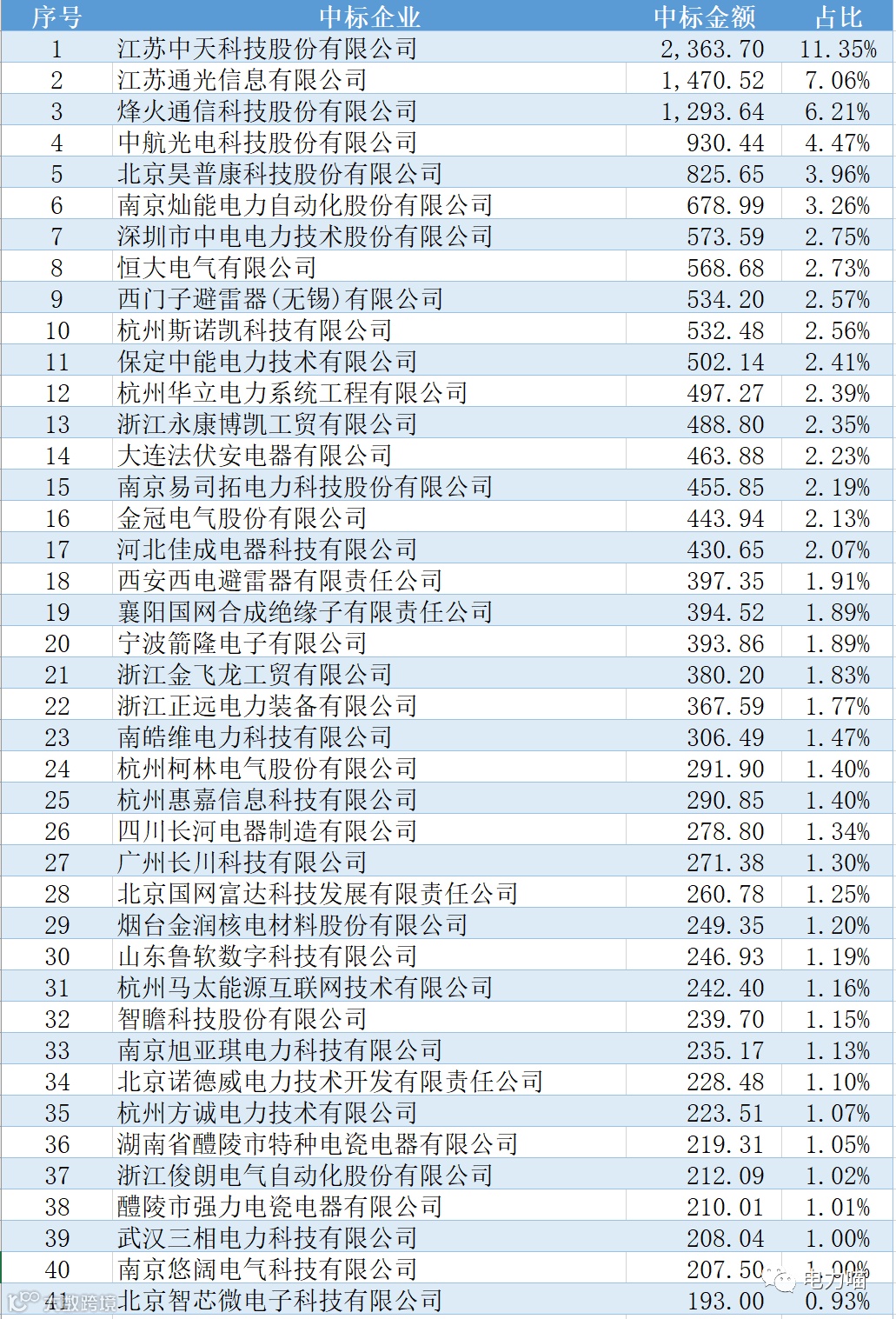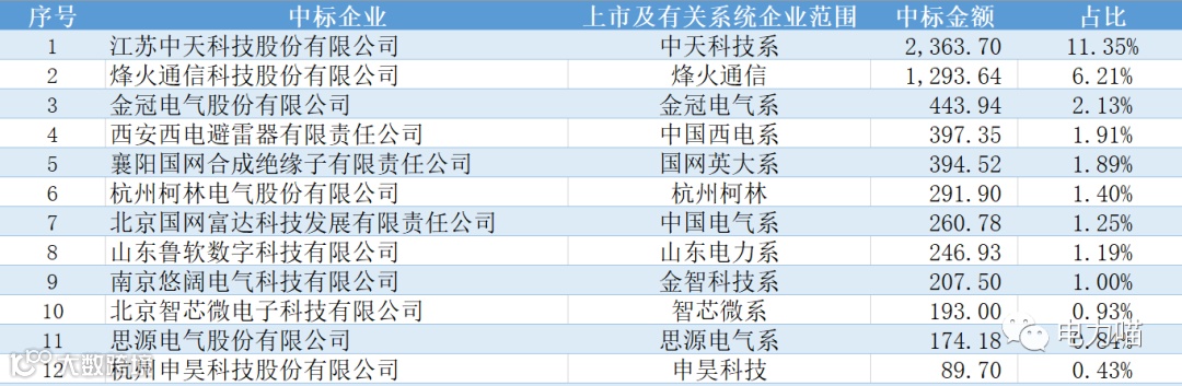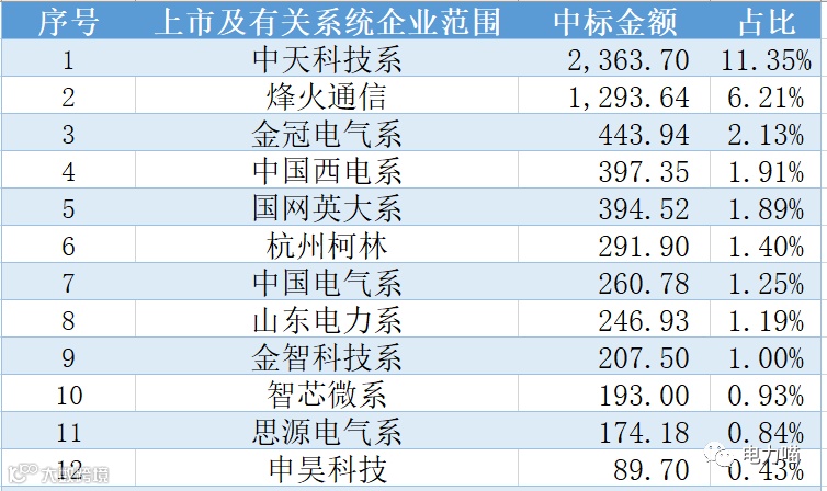 综合来看,中天科技系企业合计中标金额最高,约2,364万元,占本次招标总金额的11.35%。本项目中各系别企业都只有1家企业中标。