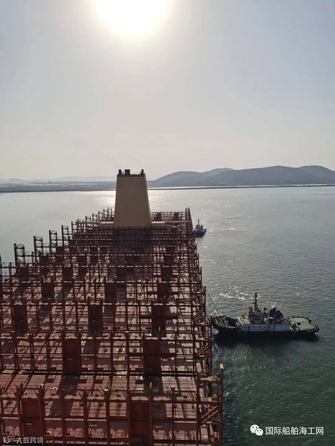 航行至恒力重工外航道时,前引巡航的拖轮反馈,40万吨船坞口门外有两条渔船,正在布网作业,海面发现大片渔网封住掉头区水域,引航员立即发出口令大船紧急停车,拖轮协助制动和保持航向,令两条带缆拖轮迅速驱离两条渔船和清理碍航渔网。