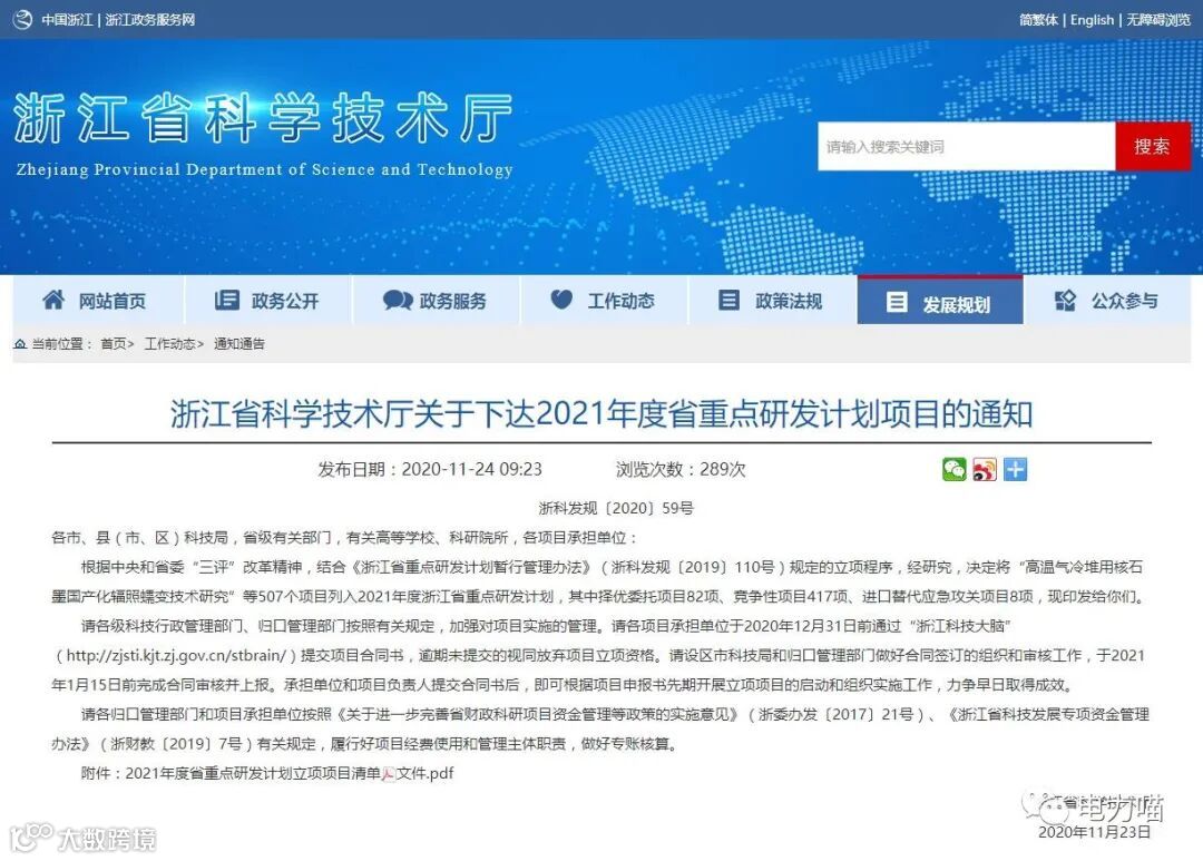 近日,浙江省科学技术厅发布《浙江省科学技术厅关于下达2021年度省重点研发计划项目的通知》。根据中央和省委“三评”改革精神,结合《浙江省重点研发计划暂行管理办法》(浙科发规〔2019〕110号)规定的立项程序,经研究,决定将“高温气冷堆用核石墨国产化辐照蠕变技术研究”等507个项目列入2021年度浙江省重点研发计划,其中与电相关的项目共有11个,这些项目将能获得省财政科研项目资金支持。