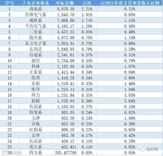 在喵喵观察的55家电气设备上市公司中,其中26家上市公司自身有中标或者下属公司(不包含平级公司、母公司)有中标,涵盖的企业数量有42家。