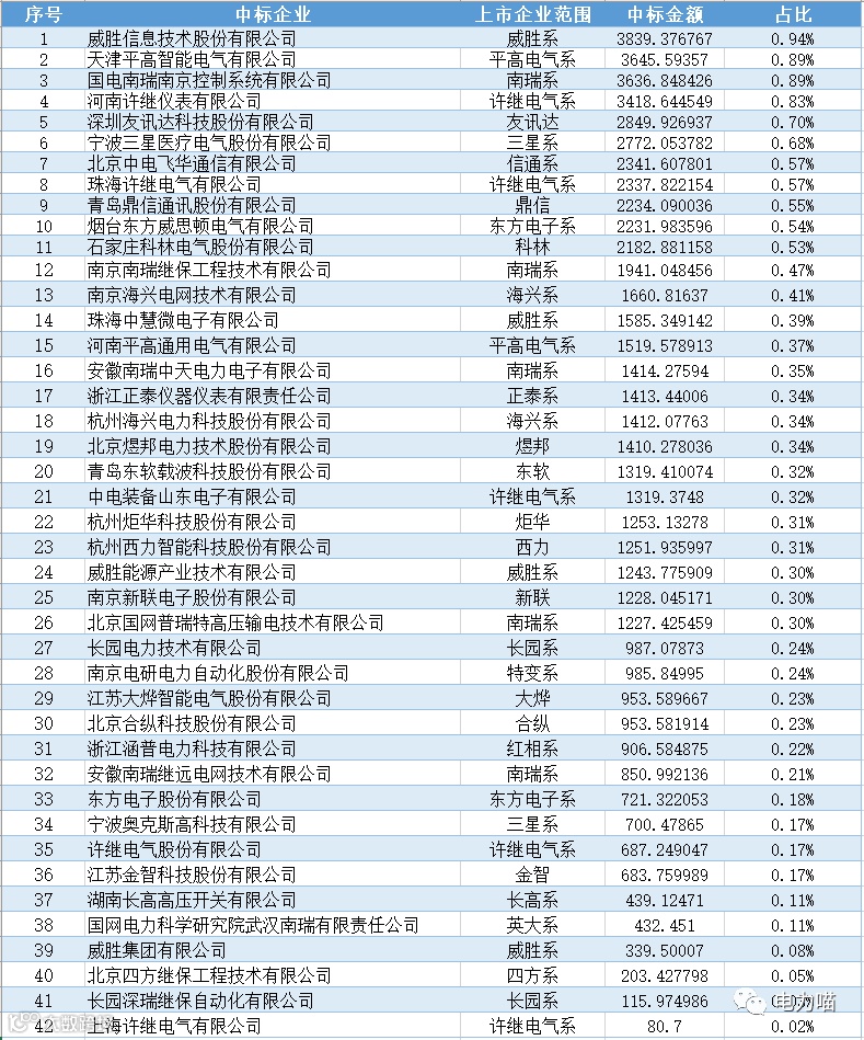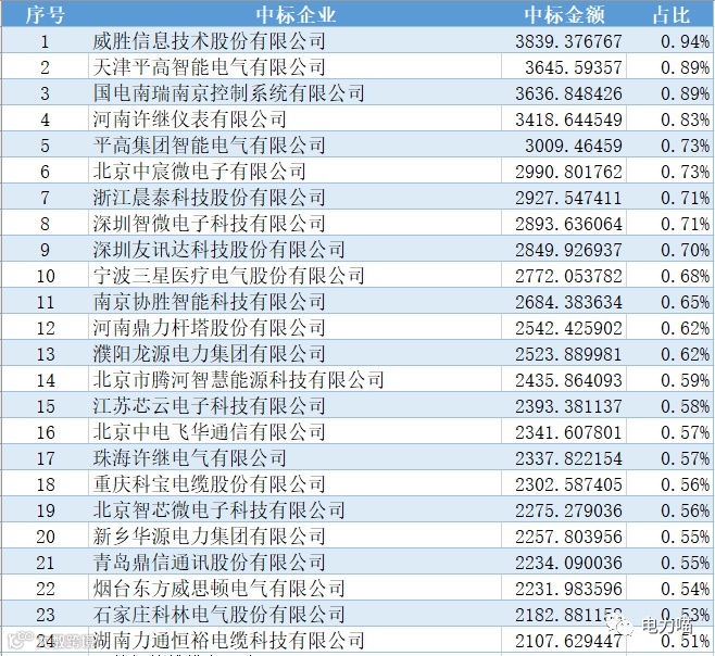 综合来看,南瑞系企业合计中标金额最高,达9070.59万元,占本次招标总金额的2.21%;许继电气系紧随其后,达7843.79万元,占本次招标总金额的1.91%;威胜系7008万元,占本次招标总金额的1.75%(其中威胜信息系5424万元,占本次招标总金额的1.32%)。
