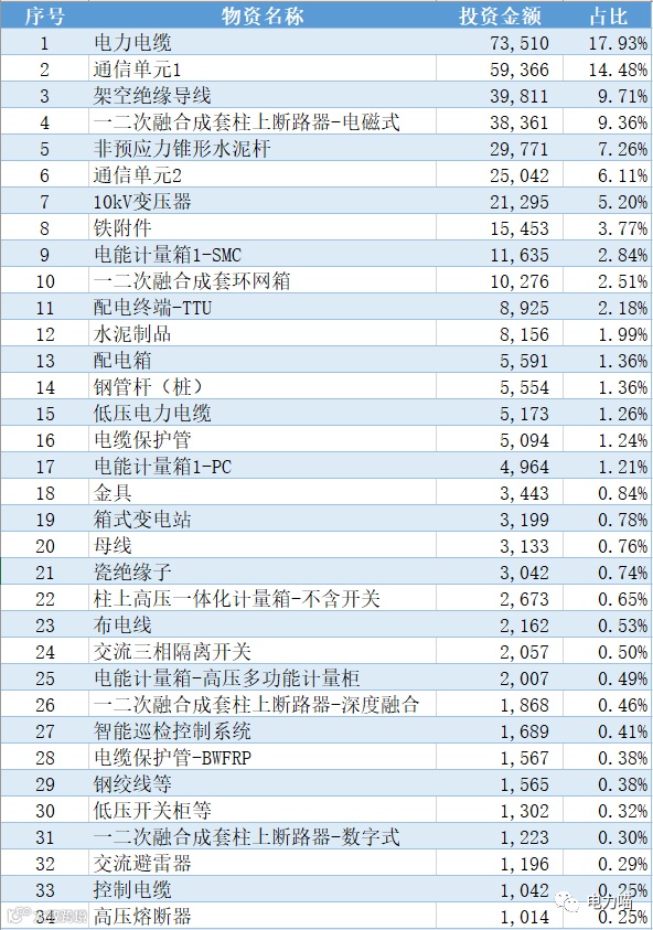 从各物资投资力度角度,结合中标金额,通信单元投资力度最大,2个品类合计8.44亿元,占比20.6%;电力电缆物资投资力度其次,共7.35亿元,约占本次招标项目的18%;一二次融合成套柱上断路器投资力度居第三,3个品类合计约4.15亿元,占比10.1%。