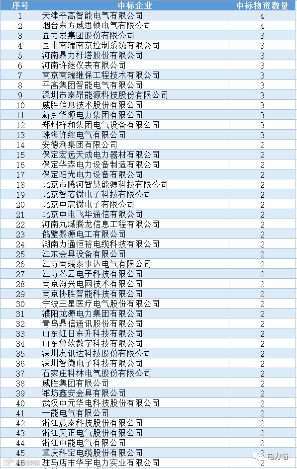 中标物资品类数量方面,共有46家企业中标2种或以上数量的物资品类,其中天津平高智能电气有限公司和烟台东方威思顿电气有限公司各中标4个品类物资。