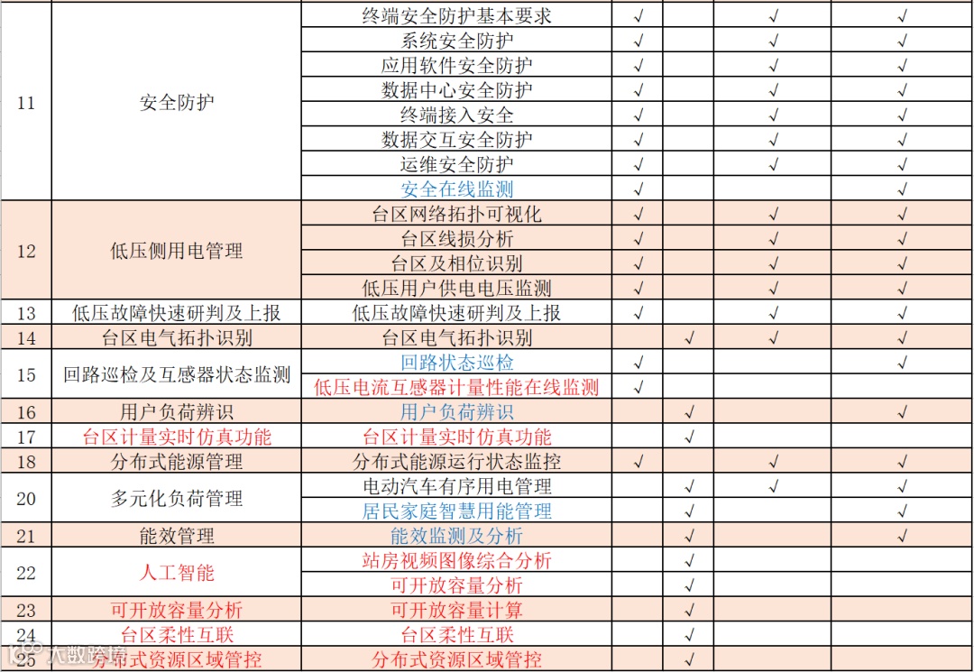 从功能项目大类来看,新台区智能融合终端增加了5个大类项目,分别是:台区计量实时仿真功能、人工智能、可开放容量分析、台区柔性互联和分布式资源区域管控。