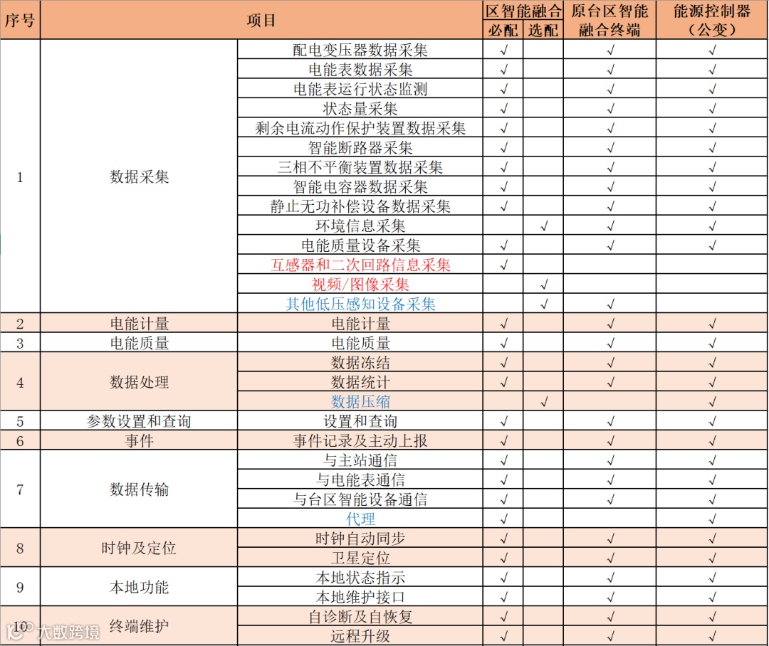 在上一篇文章《行业观察 | 部门墙开始倒塌?从智能台区融合终端新规范说起》中,喵喵对新台区智能融合终端技术规范的变化做了简要的整理,本篇我们就新台区智能融合终端、旧台区智能融合终端、能源控制器(公变)的功能要求进行了比较。