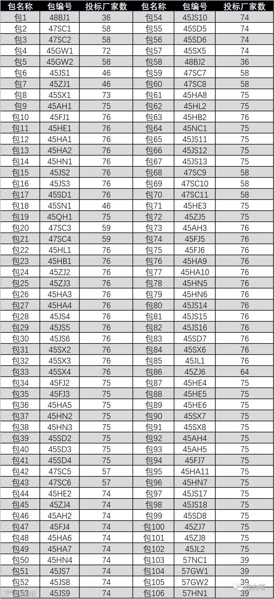 此分标参与投标企业共有52家,本次共有16个标包是52家企业全部参加。