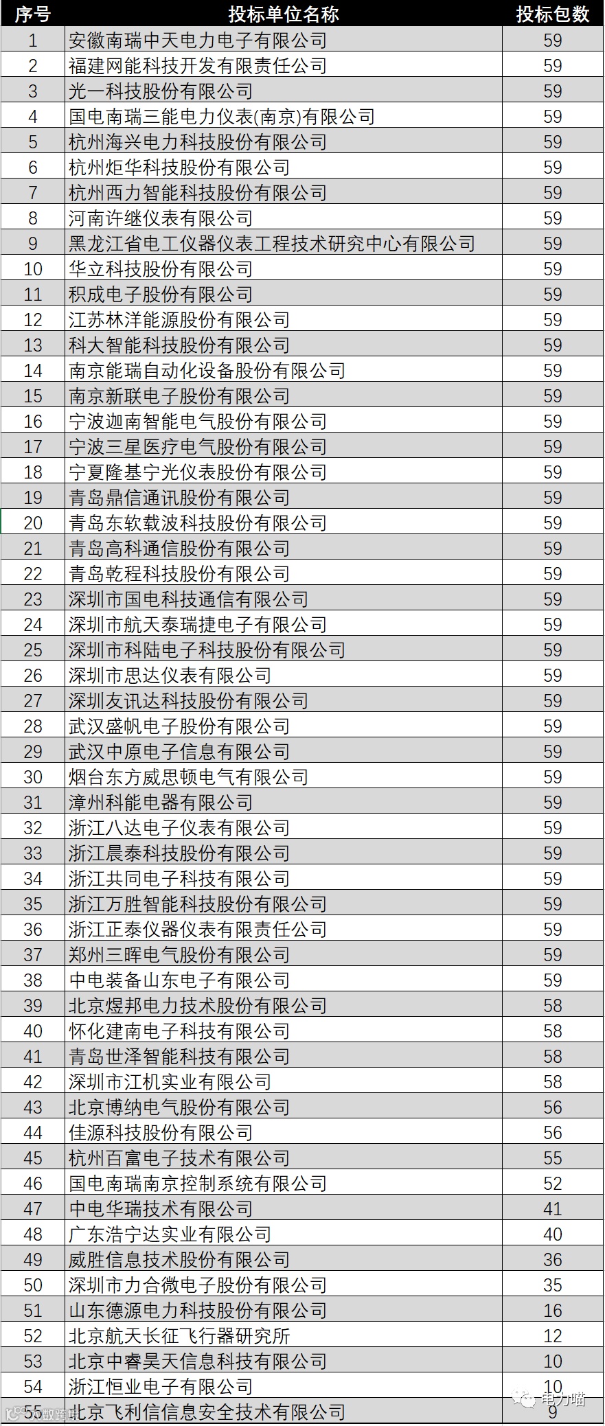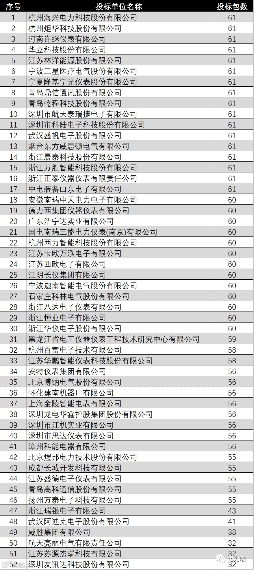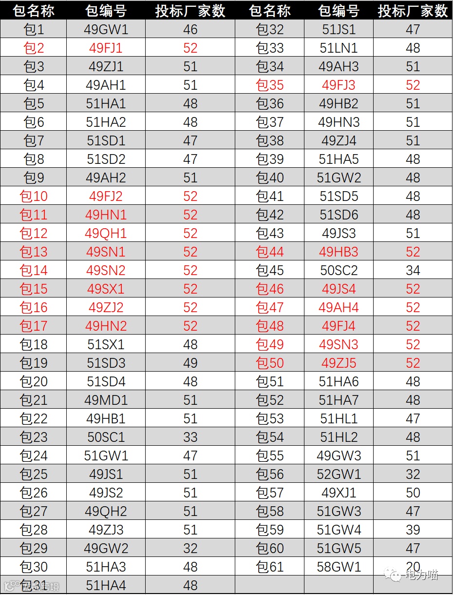 根据统计,共有38家企业参与了集中器采集器全部59个标包的投标。