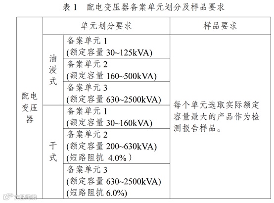 配电变压器 按相同变压器类别、相同铁心材质和结构、相同线圈导线材质、 相同绕组外绝缘介质材料及绝缘系统温度(仅适用于干式变压器),电力变压器按相同电压等级、相同调压方式、绕组数量 等划分备案单元,具体备案单元划分及样品要求见表 1 和表 2。相同备案单元的产品填写一份备案表,提交规定规格型号 的检测报告,其它规格产品可不再提交检测报告。