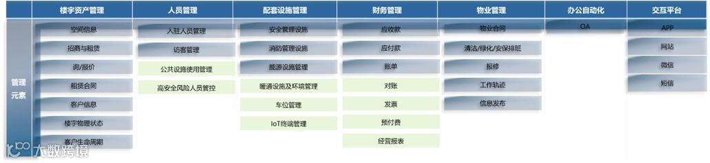 楼宇资产管理:资产管理主要关注焦点在于可用空间的管理,其业务动作涉及空间信息、招商与租赁管理、询/报价、合同、客户信息、客户全生命周期管理、楼宇物理状态。