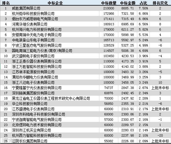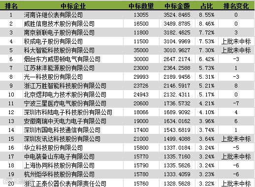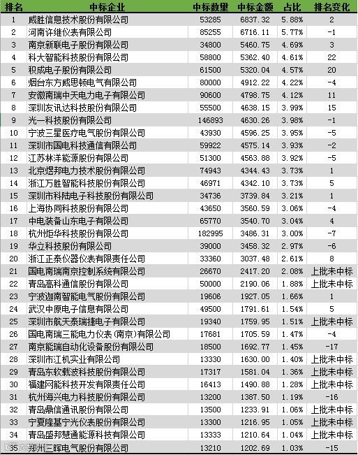 其中,积成电子股份有限公司名次提升了38名,江阴长仪集团有限公司和福建网能科技开发有限公司名次提升了22名,科大智能科技股份有限公司名次提升了21名,宁夏隆基宁光仪表股份有限公司和北京京仪北方仪器仪表有限公司名次提升了14名,深圳友讯达科技股份有限公司名次提升了13名。另外有5家企业中标名次下降了10名以上。