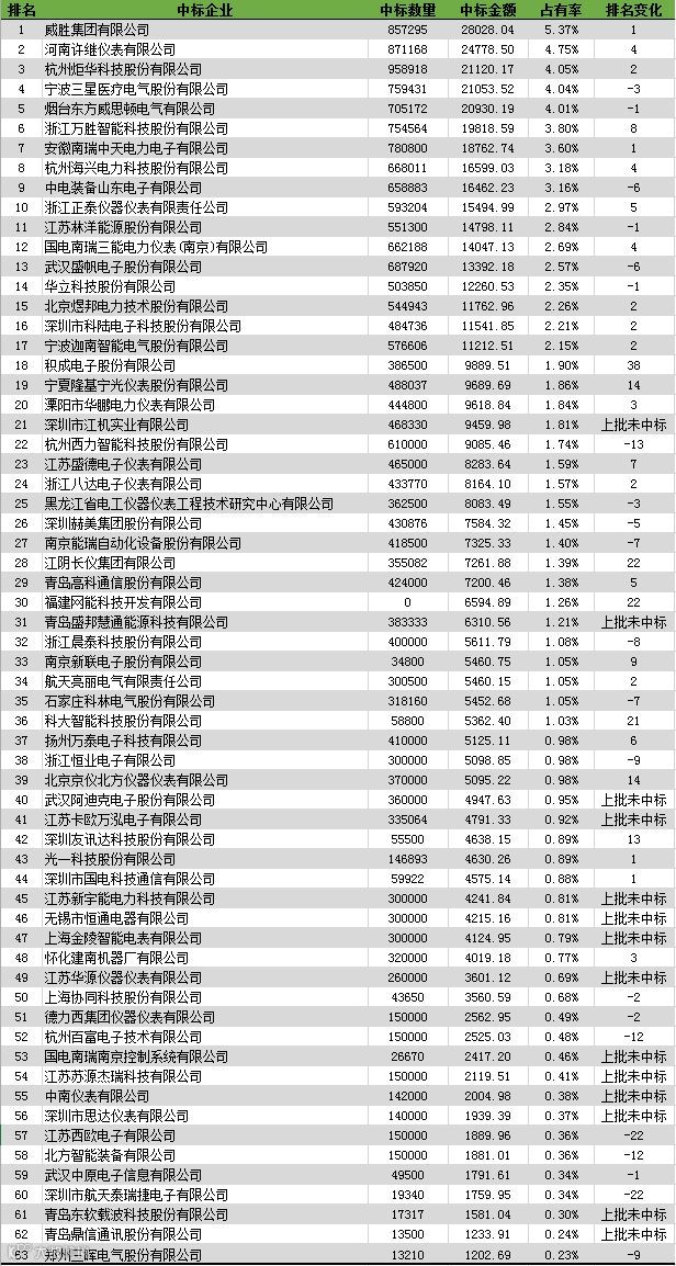 根据统计,本次招标最终总中标金额为52.15亿元,总共有64家企业实现中标,其中电能表分项中标企业共51家,比2017年第二次招标增加3家;用电信息采集分项中标企业35家,比2017年第二次招标增加5家。本次中标企业前三甲企业为威胜集团有限公司、河南许继仪表有限公司、杭州炬华科技股份有限公司,三甲名单彻底变脸。