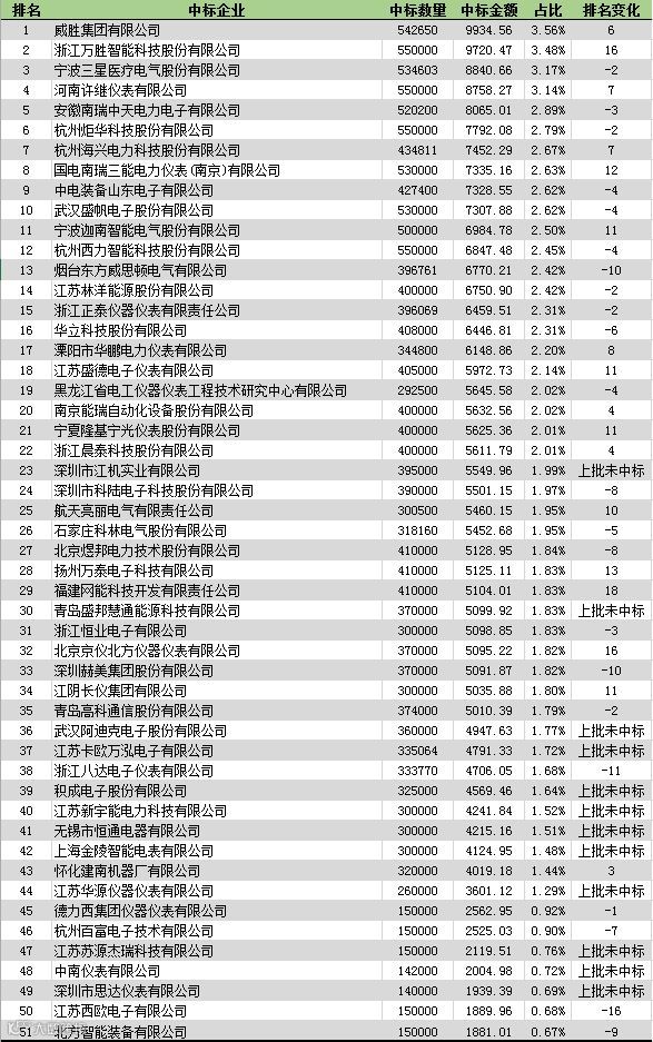 2.中标前十名企业里浙江万胜智能科技股份有限公司、河南许继仪表有限公司、杭州海兴电力科技股份有限公司和国电南瑞三能电力仪表(南京)有限公司的名次有较大幅度提升。