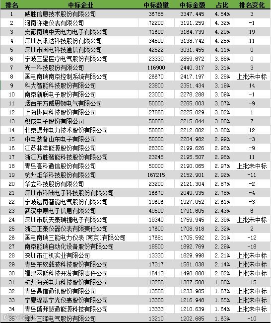2.中标前十名企业里烟台东方威思顿电气有限公司、河南许继仪表有限公司、杭州海兴电力科技股份有限公司和国电南瑞三能电力仪表(南京)有限公司的名次有较大幅度提升。
