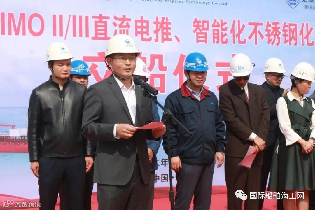 10月21日上午,芜湖造船厂公司为上海鼎衡航运科技有限公司建造的6600吨IMO II/III直流电推、智能化不锈钢化学品3#船顺利交船。江苏金融租赁股份有限公司监事会主席陈凤艳、上海鼎衡航运科技董事长李多珠等领导、中国船级社芜湖分社副总经理唐骏等领导、芜湖海事局相关领导以及芜湖造船厂经营层共同出席交船仪式。