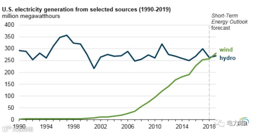 据能源情报署(EIA)称,自2008年以来,可再生能源提供382 TWh-风力发电量从55 TWh上升到2018年产生275 TWh(占总发电量的6.5%)。2018年常规水电在可再生能源组合中占主导地位风量略高于292 TWh(占总发电量的6.9%)。