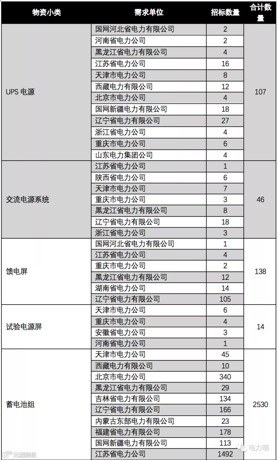 在第一季度,共有20个省级电力公司有相关9种小类物资的需求。其中:UPS电源有12个单位有需求;交流电源系统有7个单位有需求;馈电屏有6个单位有需求;试验电源屏有4个单位有需求;蓄电池组有10个单位有需求;一体化电源(智能)系统有14个单位有需求 ;一体化电源系统有12个单位有需求;直流充电机有1个单位有需求;直流电源系统有14个单位有需求。