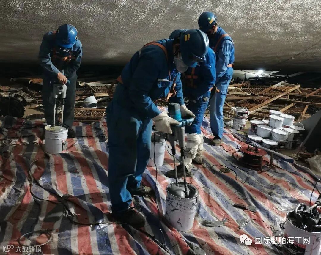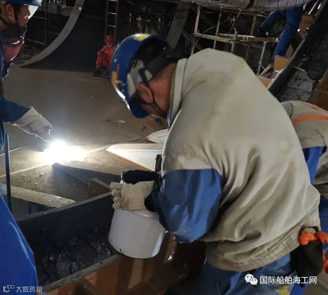 吊装开始后,大家严阵以待,誓要顺利完成环氧树脂的浇注。待LNG 罐第一次下放靠模再起吊后,这环氧浇注工作便开始了,班组的师傅们快速地将环氧抹平、填充、再抹平、再填充,不断重复这道工序直至厚度达到工艺要求。