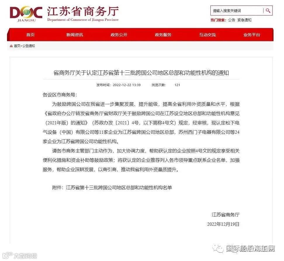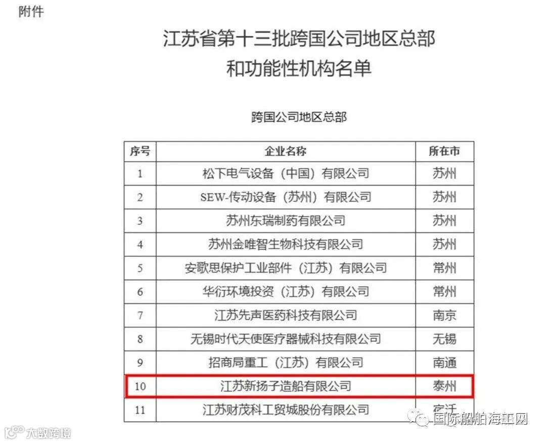 近日,江苏省商务厅公布了江苏省第十三批跨国公司地区总部和功能性机构名单。扬子江船业集团江苏新扬子造船有限公司被认定为省级跨国公司地区总部。