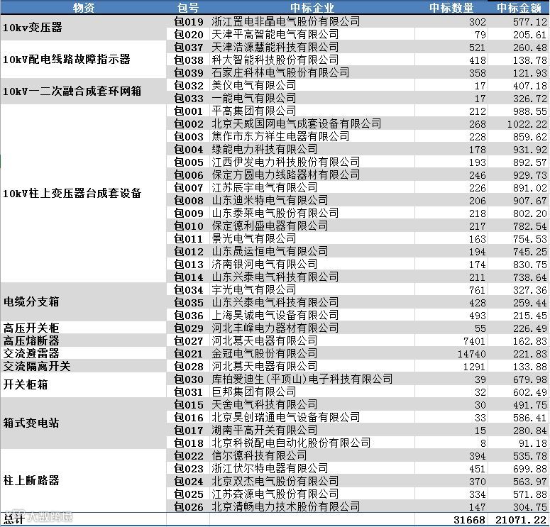 截止到12月03日,第四批配网物资协议库存已有25个项目发布中标候选人公示,共有558家企业中标设备类物资,其中312家中标2个以上包。