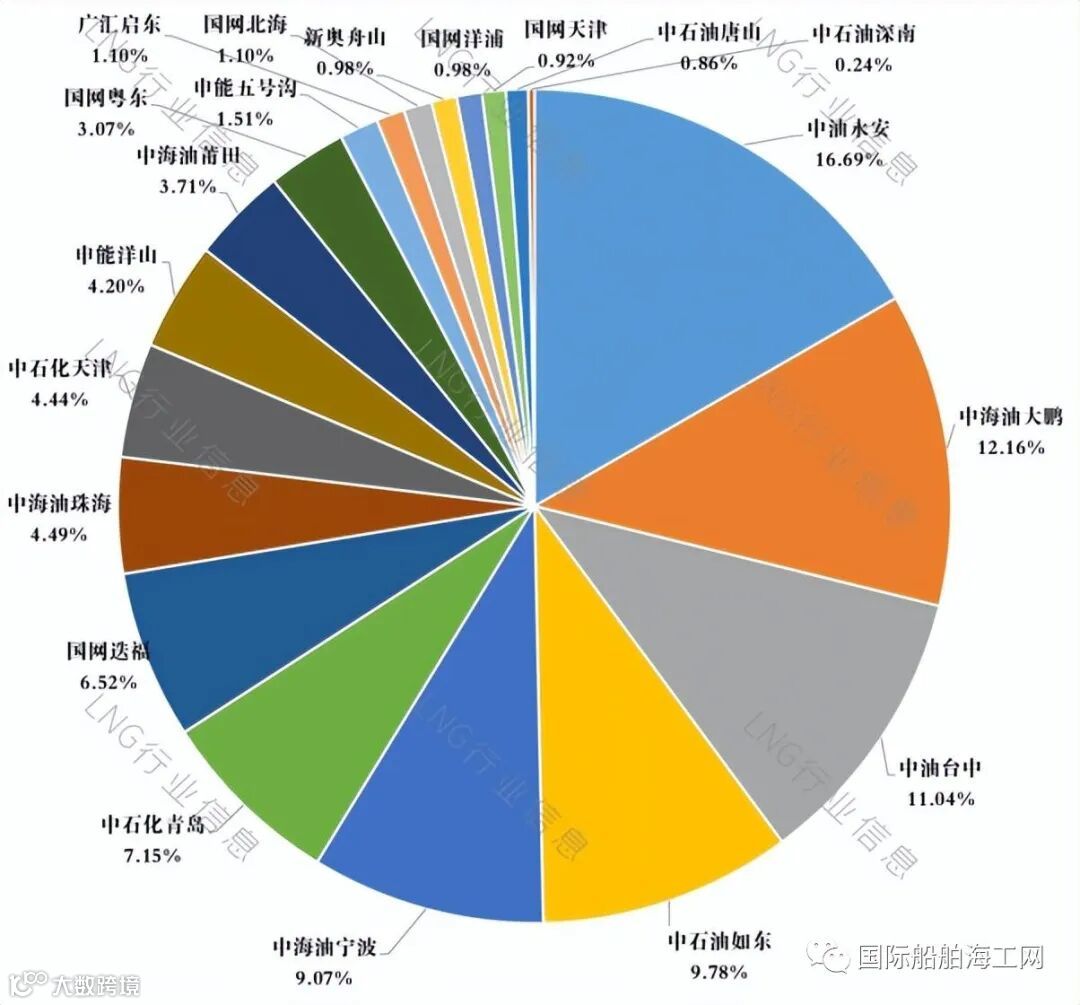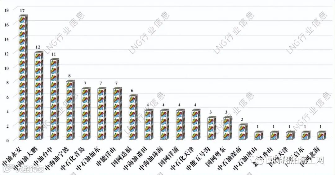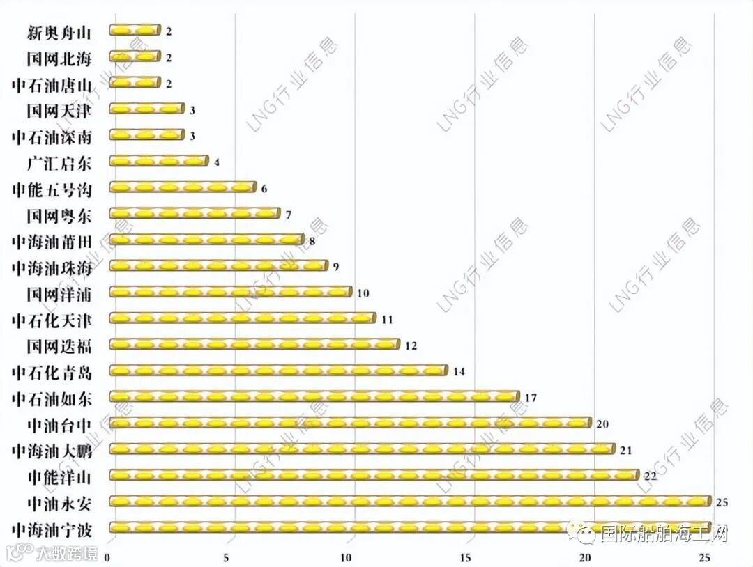 2022年8月,中海油宁波、中油永安、申能洋山、中海油大鹏、中油台中、中石油如东、中石化青岛分别以25天、25天、22天、21天、20天、17天、14天的船舶在港天数(包含卸船、装船船舶在港天数,不含国网天津浮式船在港天数)排名前七。