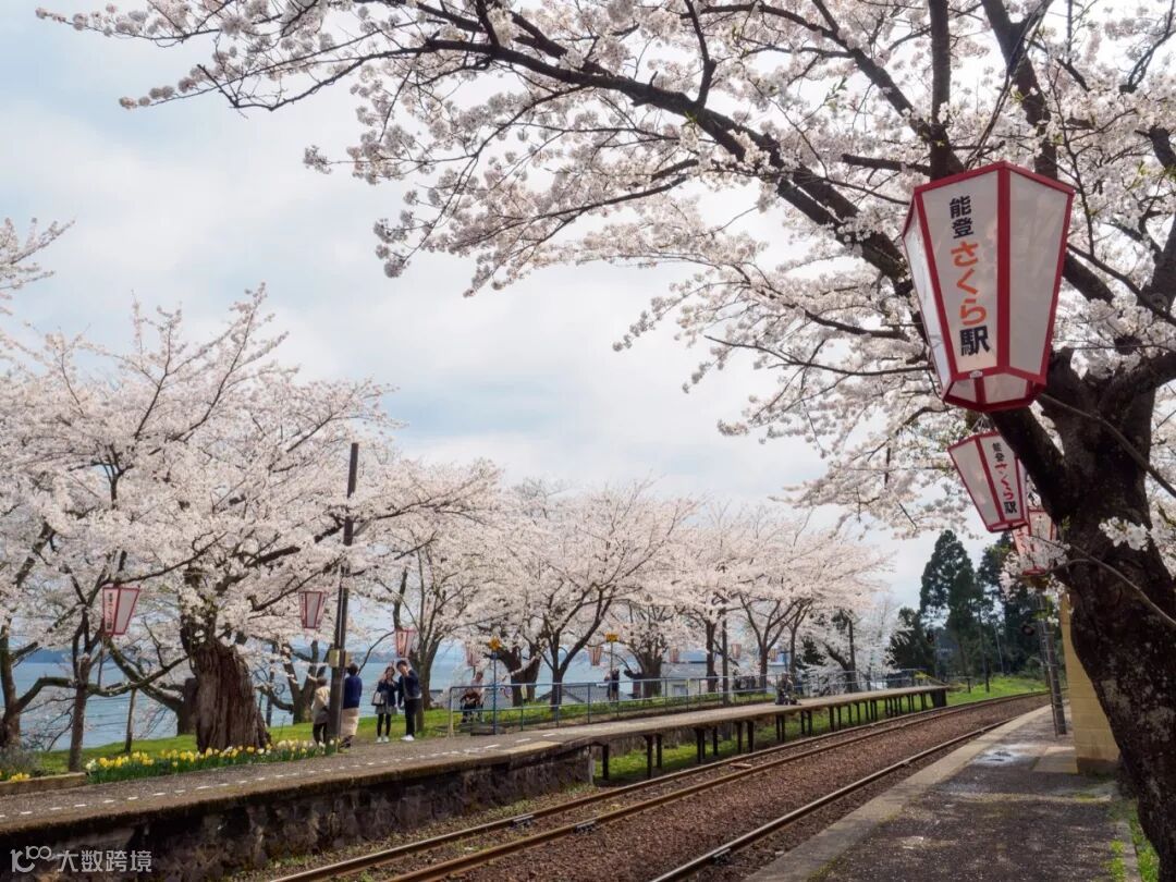 大海、电车和樱花同框是一种怎样的美?能登鹿岛站是能登半岛上最著名的赏樱胜地之一,依然是一座无人值守的小站,春天很多人都会特地来这里赏樱。