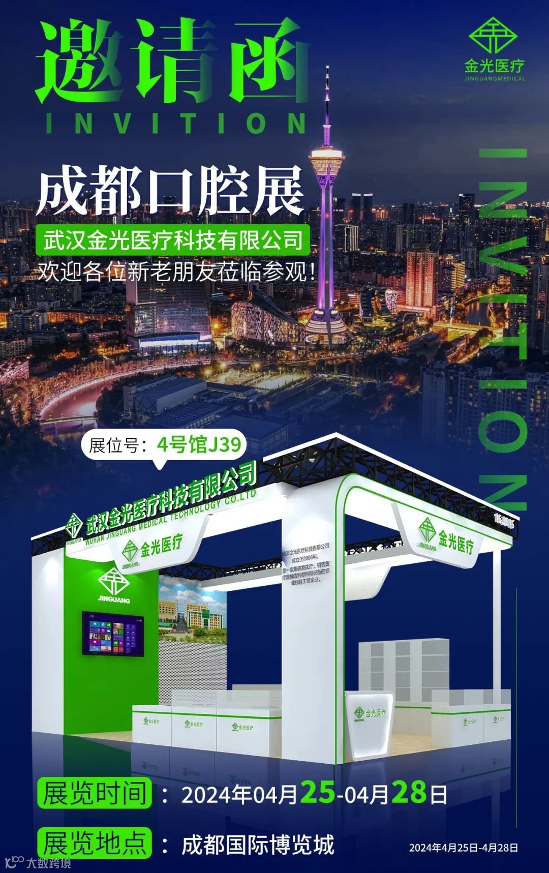 2024年成都口腔展,于4月25日-28日在成都国际博览城召开,“武汉金光医疗科技有限公司”诚邀各位新老朋友莅临金光展台4号馆J39参观!