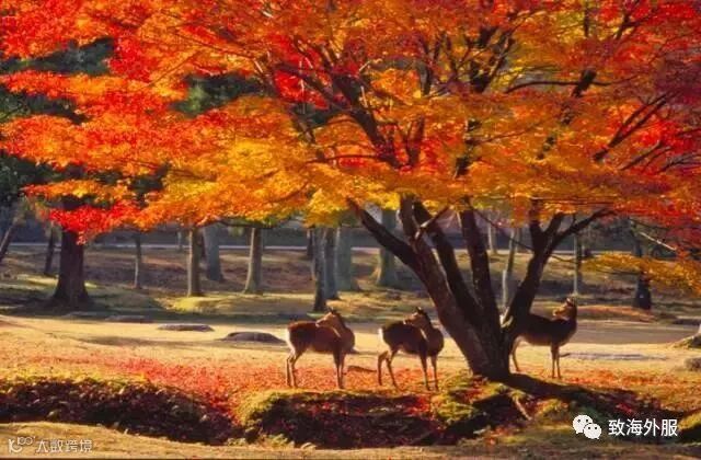 春天有樱花,秋天有枫叶,更重要的是,还有一堆又萌又精明的小鹿!这样卡哇伊的奈良,吸引了一批又一批的游客~秋天赏枫的话,更推荐去吉野山,道路上随处可见落叶,一路伴随你进山! 运气够好,遇到前一日下雨的话,就很容易出现云海的景观,被美丽云海包围的红色吉野山更美!