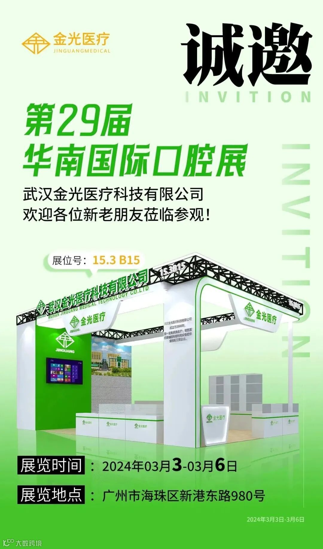 2024年华南国际口腔展,于3月3日-6日在广州市海珠区新港东路980号召开,“武汉金光医疗科技有限公司”诚邀各位朋友莅临金光展台参观!