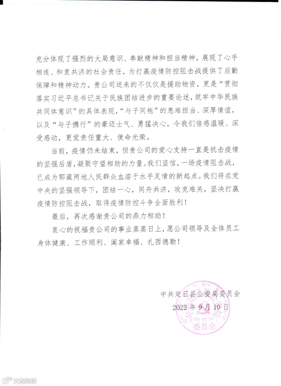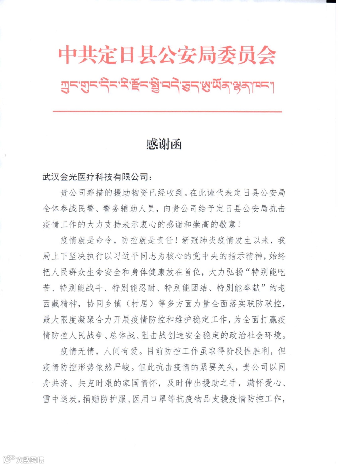 2022年9月10日上午,武汉金光医疗科技有限公司捐赠的5万片医用外科口罩,1000套防护服已顺利抵达西藏自治区日喀则市定日县公安局,定日县公安局特发来感谢函,表达了对武汉金光的感谢。