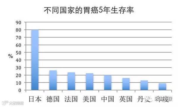 中国和美国的癌症治疗有差距,但在有的癌症上没什么区别,胃癌病人的 5 年生存率都只有 20%。面对胃癌,中国、美国都输了,但是日本却成为最大赢家!日本胃癌的 5 年生存率可以达到 80%,简直甩了其他国家好几条街日本治疗胃癌的逆天效果。