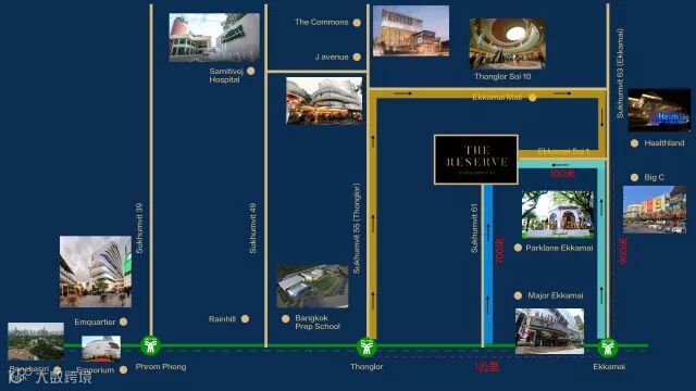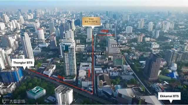 The Reserve Sukhumvit 61公寓位于曼谷素坤逸路61巷,介于Thonglor主路和Ekkamai主路的中间。距离BTS Ekkamai站5分钟路程,距离BTS Thonglor站10分钟路程,距离Emquartier和Emporium购物中心也仅2个站即可达到。众所周知,Ekkamai-Thonglor区是目前曼谷最热门、时尚和备受追捧的顶级住宅区,无数富人聚居于此。区域内社会名流云集、高档商场林立,这个地段的尊贵级数,可媲美香港的跑马地,相当于东京的银座。
