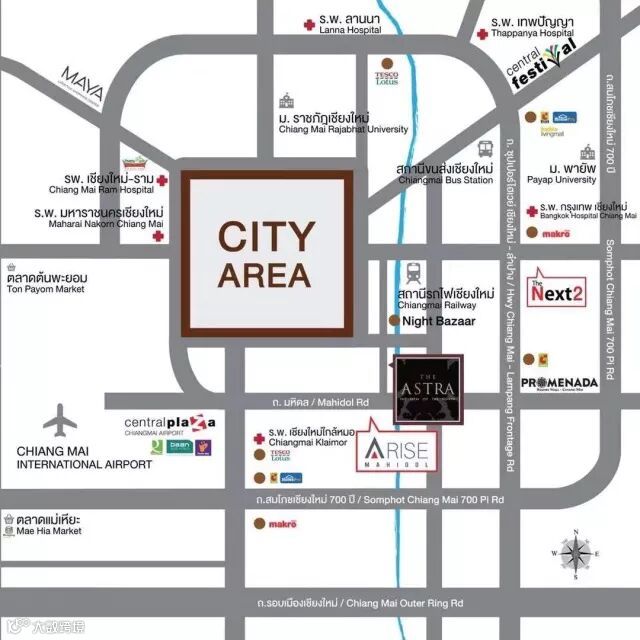 离Arise项目1公里处(开车2分钟)就是central airport plaza购物中心,作为整个泰北地区最大的购物中心,囊括吃喝玩乐一站式所有的购物需求;另外,泰国很多银行周末不营业,而在这家shopping mall里面的五六家银行都可以营业,人流量大,是最受清迈人欢迎的shopping mall之一。相对于古城和宁曼路这两大饱和的商圈房价而言,可以说,Mahidol路是清迈附近最具投资价值的路段之一。