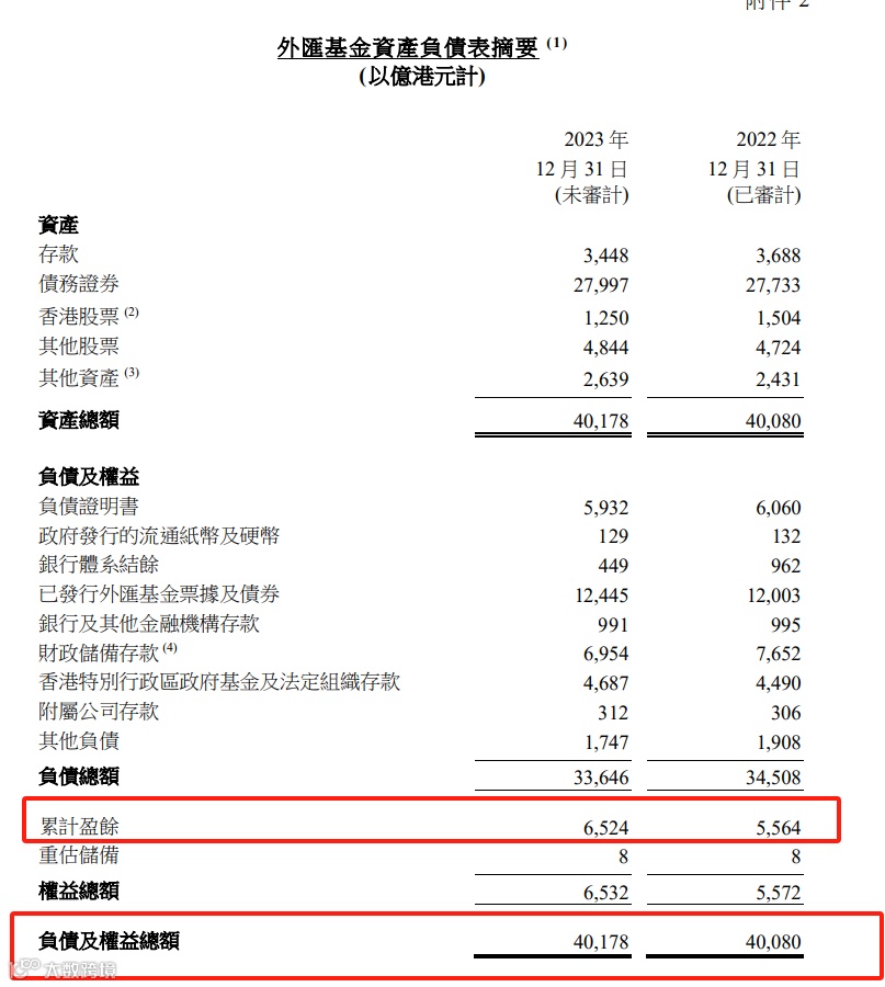 外汇基金资产负债表显示,其总资产去年增加98亿港元,至2023年底外汇基金的资产规模达到4.0178万亿港元。截至2023年12月底,累计盈余为6524亿港元。