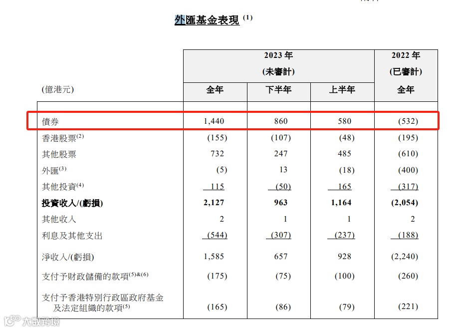 具体来看,债券投资收益1440亿港元;香港股票投资亏损155亿港元;其他股票投资收益732亿港元;非港元资产外汇估值下调5亿港元;其他投资收益115亿港元。