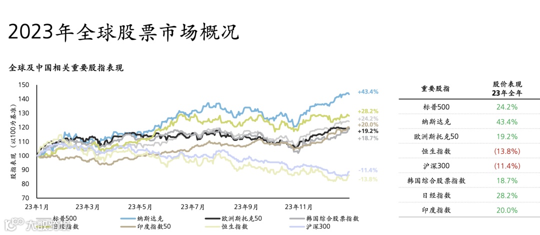 相关数据显示,2023年全年,标普500指数涨幅为24.2%,纳斯达克指数为43.4%,欧洲斯托克50指数为19.2%,韩国综合股票指数、日经指数、印度指数涨幅也分别达18.7%、28.2%和20%;COMEX黄金全年累计涨幅达13.45%,为2020年来最大年度涨幅。