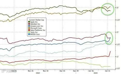 今年以来,去年强劲的“科技七姐妹”正在变成“科技四巨头”,微软市值超过了苹果,亚马逊市值超越了谷歌,Meta高光一刻,英伟达一路走高,特斯拉股价持续走低“最掉队”。