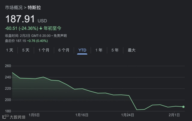 英伟达将于本月晚些时候公布最新业绩,今年以来股价已经飙涨34%;特斯拉此前发布财报显示四季度业绩不及预期,并警告今年增长将放缓,今年以来股价累跌24%。