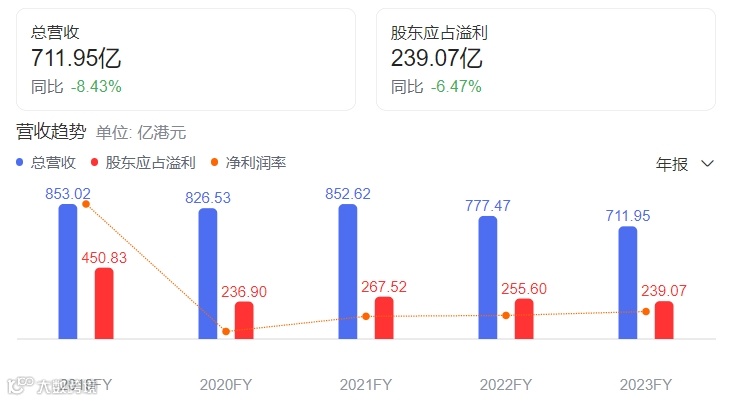 根据新鸿基地产2022/23财年业绩报告,新鸿基出现营收和净利润双降的情况,但出租物业为集团带来庞大且相对稳定的经常性溢利。光靠收租,新鸿基一年收租近200亿港元。以2022财年为例,新鸿基净租金收入248亿港元。