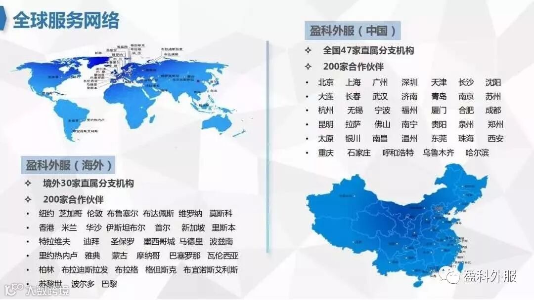 盈科外服总部位于上海,在中国68个主要城市拥有分支机构,在全球包括美国、英国、德国、法国、迪拜、新加坡、香港、印度、泰国、印尼、越南等世界各地拥有超过150个分支机构与服务网点。盈科外服的客户不仅包括行业巨头、跨国公司,还包括中小企业、政府机构以及各类商协会。覆盖全球的服务网络,极为广泛的中外客户资源,及高度国际化的专业团队,使得盈科外服在跨国直接投资服务领域拥有明显优势。