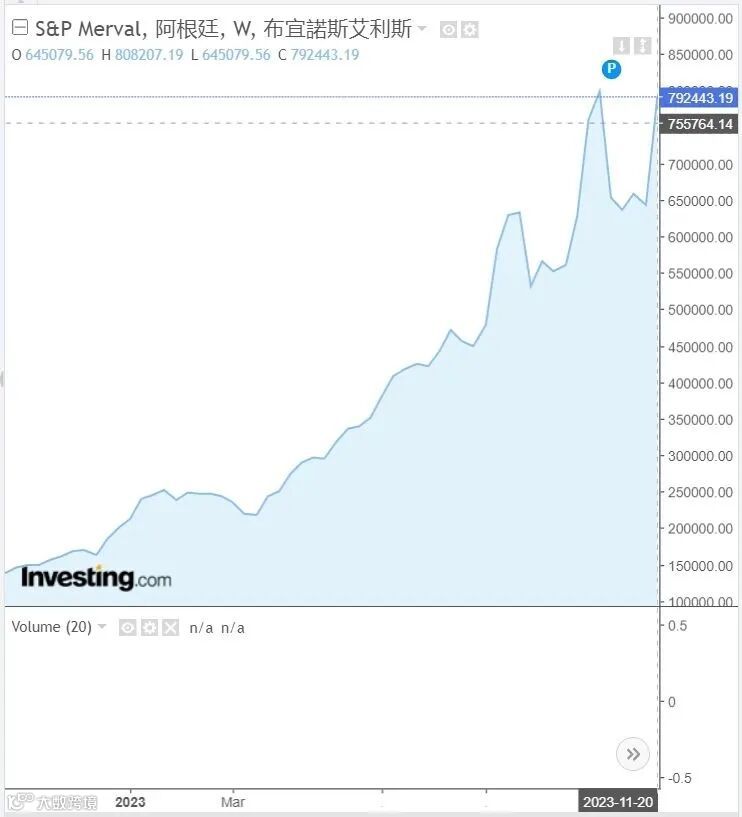 11月20日布宜诺斯艾利斯证券交易所开市后,阿根廷标准普尔Marvel指数开盘暴涨20%,随后涨幅收窄,但仍超过10%。