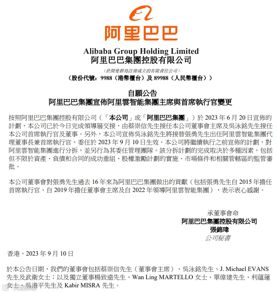 9月10日,阿里巴巴集团按计划完成内部权利交接,蔡崇信接替张勇成为集团董事会主席。从这一刻起,“马云背后的男人”正式走向台前。