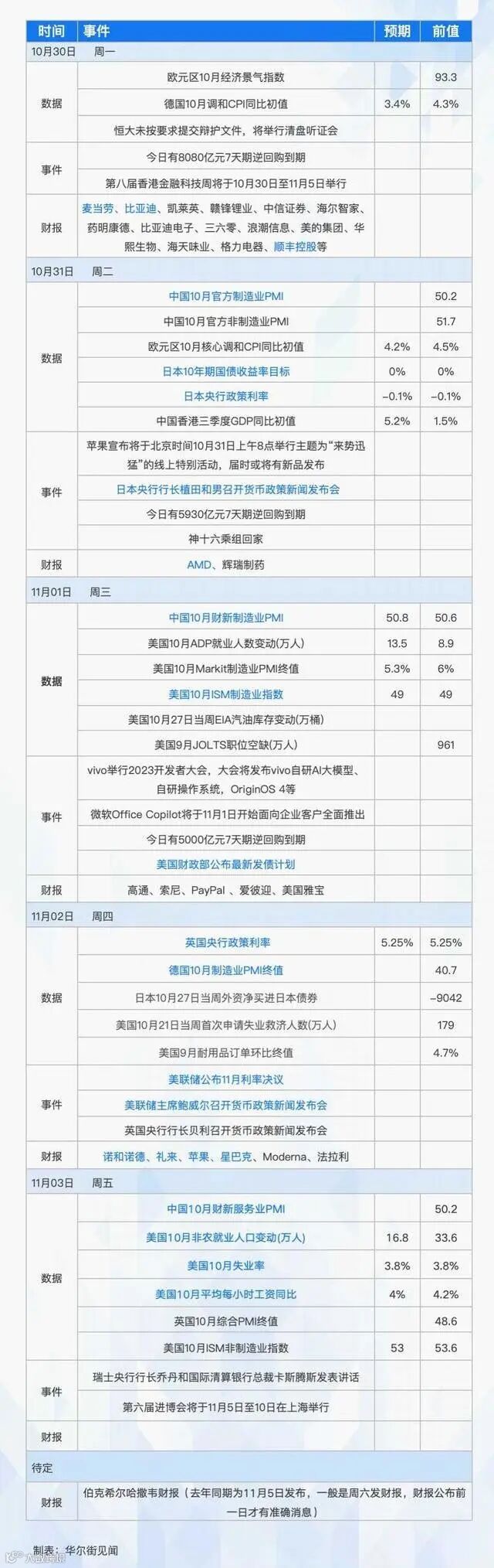 本周重点关注美国10月非农数据、中国10月PMI,欧元区10月CPI,美日央行议息会议;此外,美国财政部公布最新发债计划,香港高院将举行恒大清盘听证会,财报方面,减肥药龙头诺和诺德、礼来财报,苹果发布财报。