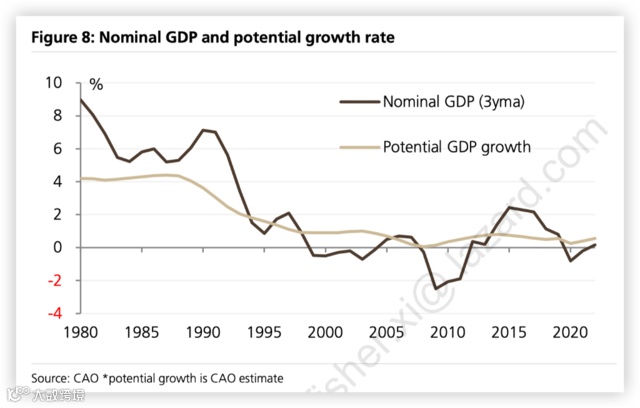 2013年,日本首相安倍晋三出台一系列以货币宽松政策、灵活的财政政策和结构改革为主体的安倍经济学,日本经济终于摆脱通缩,但名义GDP和潜在经济增长率仍然低迷,再加上日本人口结构转型(总人口和劳动适龄人口减少、社会老龄化)的负面影响,日本经济复苏的进程仍然缓慢,总需求依然不足。直到十年以后,令和年的日本央行才终于看到了期待已久的“可持续通胀”的影子。