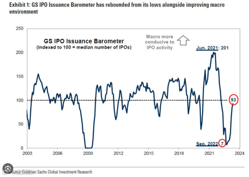 根据高盛旗下衡量IPO整体环境的一项指标:IPO发行晴雨表(IPO Issuance Barometer)显示,目前该数据已从9月最低点7飙升至93,录得2022年3月以来最高水平。同时,该模型预测下半年这一数据将达到119。(注:这一指标达到100,表示IPO发行恢复到典型频率。)